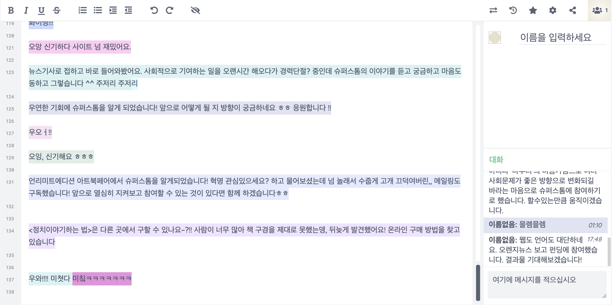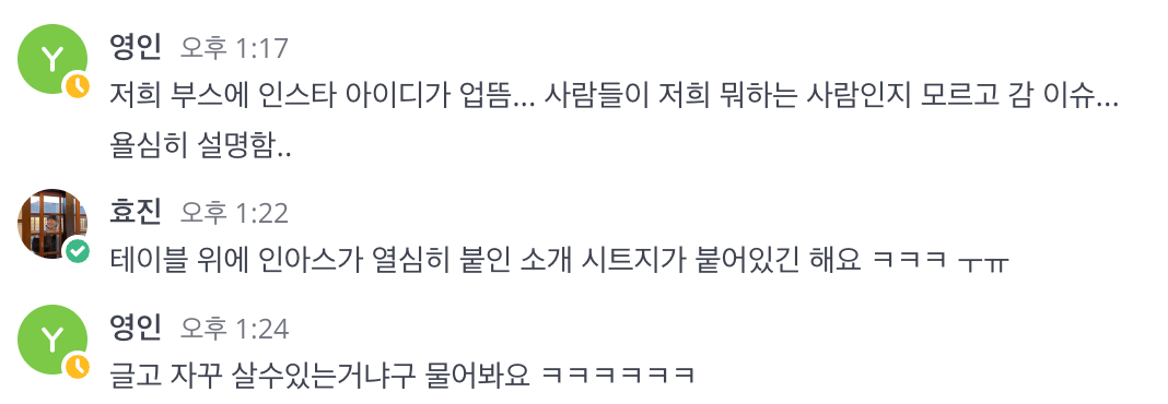 혁명의 효능은 살 수 없다. 왜냐면 혁명은 같이 만들어나가는 것이니까. 그리고 우리는 함께하는 방법을 좀 더 다채롭게 시도해 볼 필요가 있다. 북페어에 나간 건 슈퍼스톰과 오늘의풍경이니까 자연스럽게 할 수 있는 시도였다. 그럼 다음 번엔 우리에게 어색하고 부자연스러운 시도도 해보면 어떨까? 그리고 우리와 같은 지향을 가진 다른 사람들은 어떤 시도를 하고 있을까? 우리는 만날 수 있을까? 이 글도 좀 더 의외의 사람들에게까지 가 닿기를 바라며. CTA(Call to Action, 웹페이지에서 이용자에게 행동을 요구하는 것)를 잊지 않아본다.